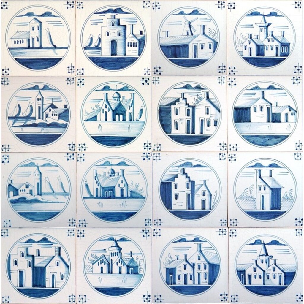 Traditioneel gedecoreerde tegels met landschap in cirkel (ca.1850). Ambachtelijk gemaakt in Friesland. Bestel direct online!